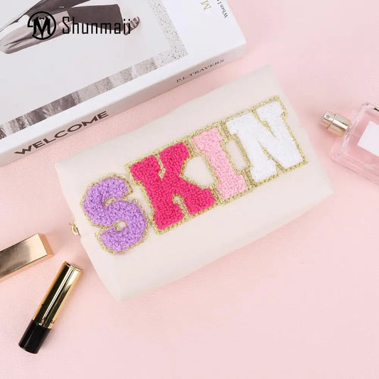 3PCS Preppy Patch Makeup Bag with Patches Chenille Letter Face Hair Skin Bag Zipper Closure PU Leather for Travel Accessories