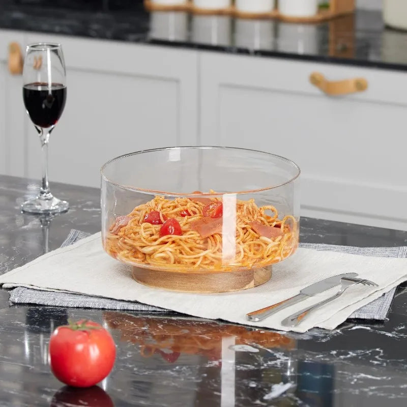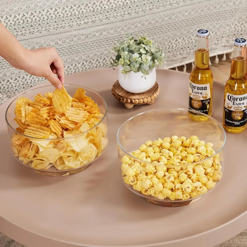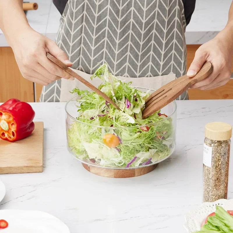 Large Salad Bowl Set, Glass Bowl with Acacia Wood Base and Salad Hands, Serving Bowls for Fruits,