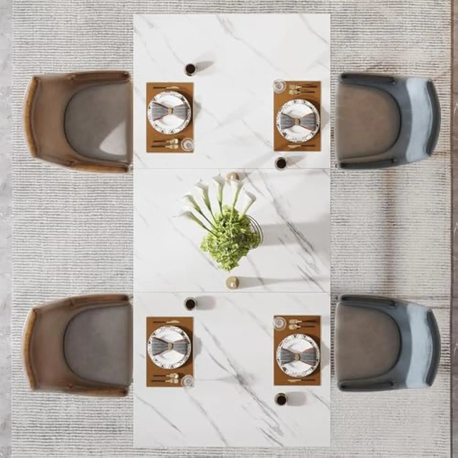 Luxurious faux marble veneer: the tabletop features a faux marble veneer brings a touch of elegance to your dining space, exuding sophistication and enhancing the overall ambiance, making every meal a memorable experience High quality materials: the rectangle dining table is made of high quality mdf boards, supported by heavy duty metal legs for durability.